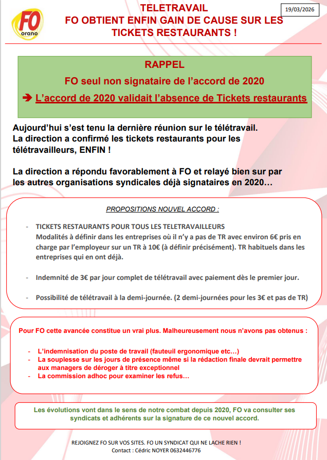 Dernière réunion ce jour sur le Télétravail (ou avant dernière pour relecture et précisions éventuelles). Le combat de FO sur le sujet des tickets restaurants paie enfin ! (avec 5 / 6 ans de retard).